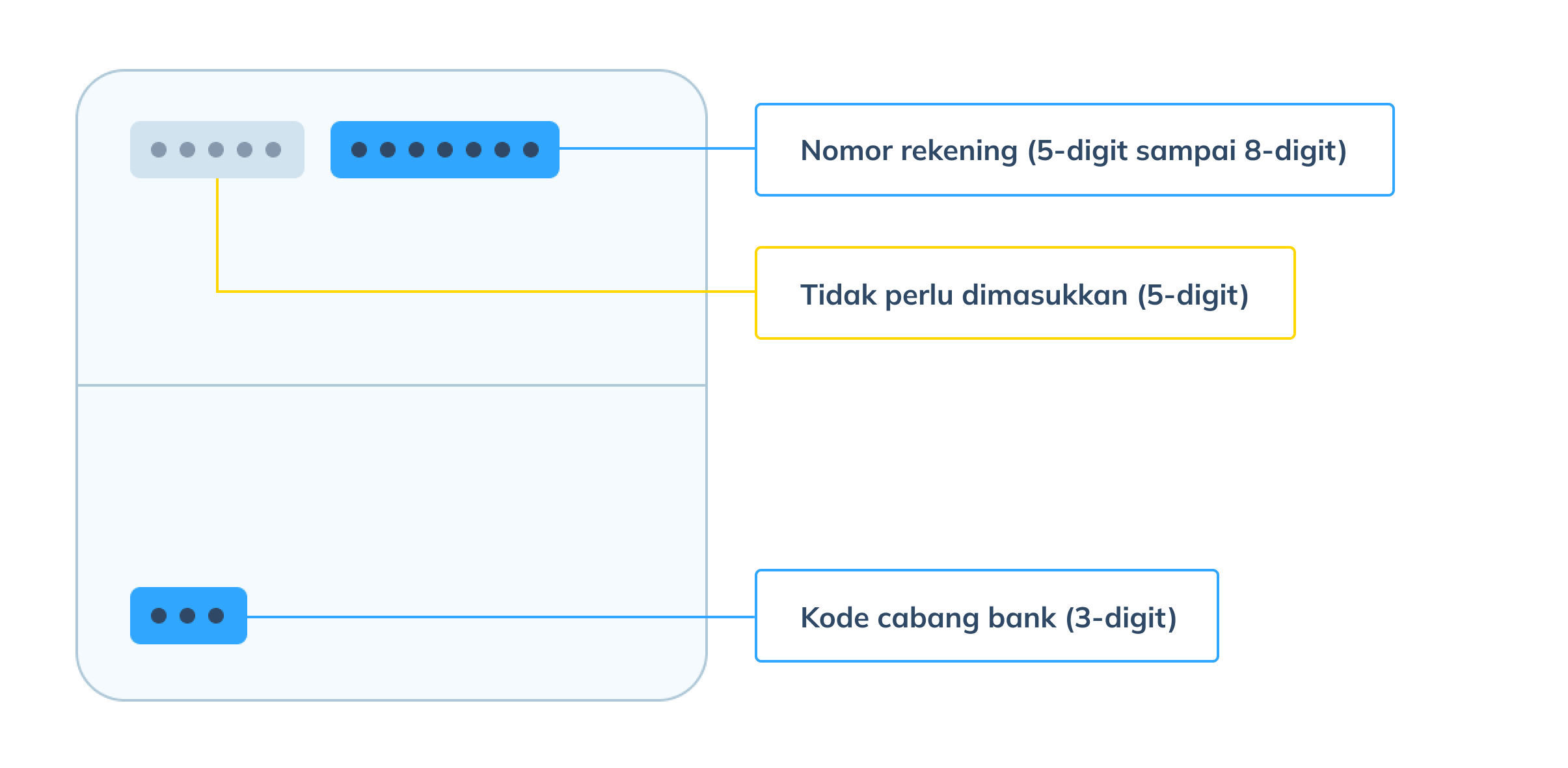 - 5-digit pertama sebelum Nomor Rekening digunakan untuk transfer lokal. Dan saat melakukan pengiriman uang menggunakan Topremit, kamu tidak perlu memasukkan-nya.